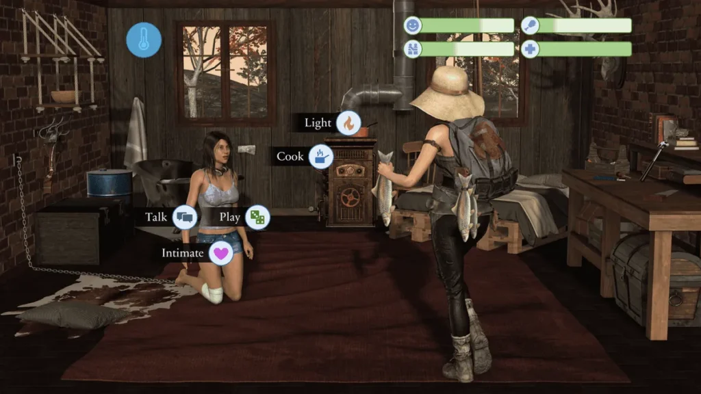 This isn’t a passive movie. Every dialogue option, every decision about how to spend your day—teaching speech, exploring her body awareness, scavenging, or resting—shapes the narrative. The Teen Zombie in Your Cabin gameplay loop is all about managing two key resources: your cabin’s supplies and her development.